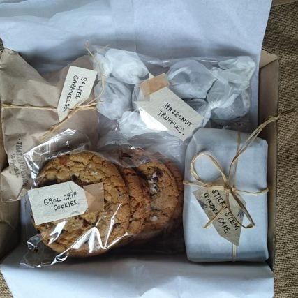 Winter Box: Treacle Tart (2 slices), Carrot Cake (2), Orange Tiffin (2), Peanut Chocolate Cookies (4).